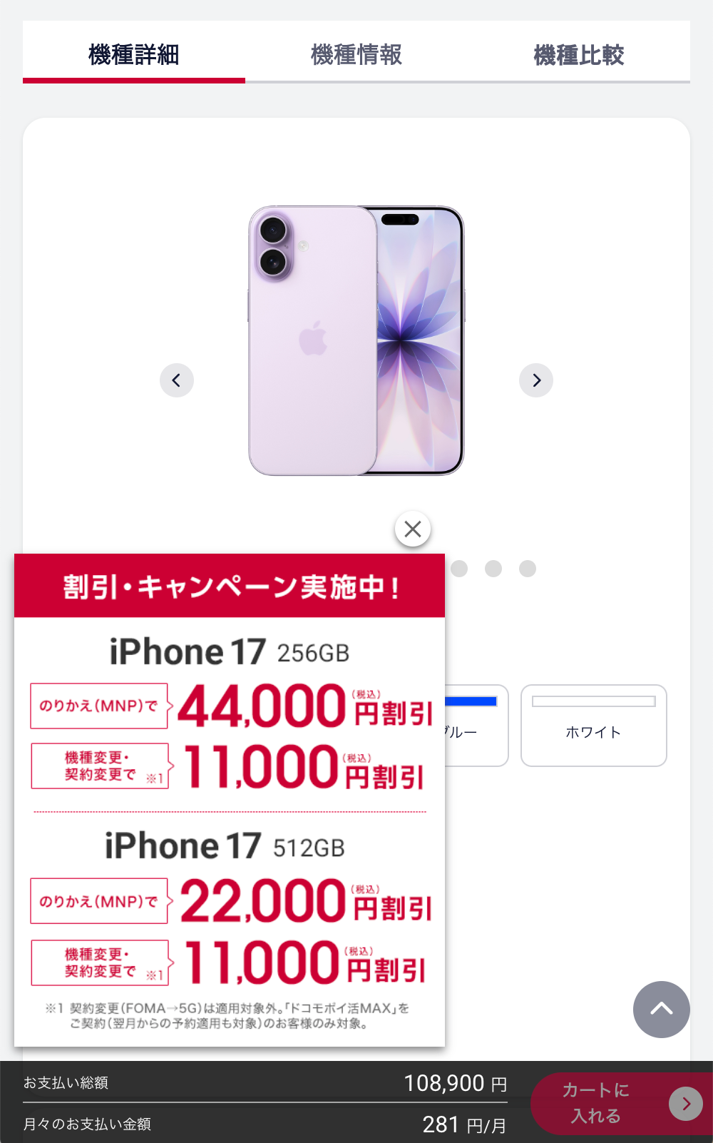 ドコモのiPhone 17(256GB)は、他社(au、ソフトバンク、楽天とか)から乗り換えると「5G WELCOME割」で44,000円割引きになる。