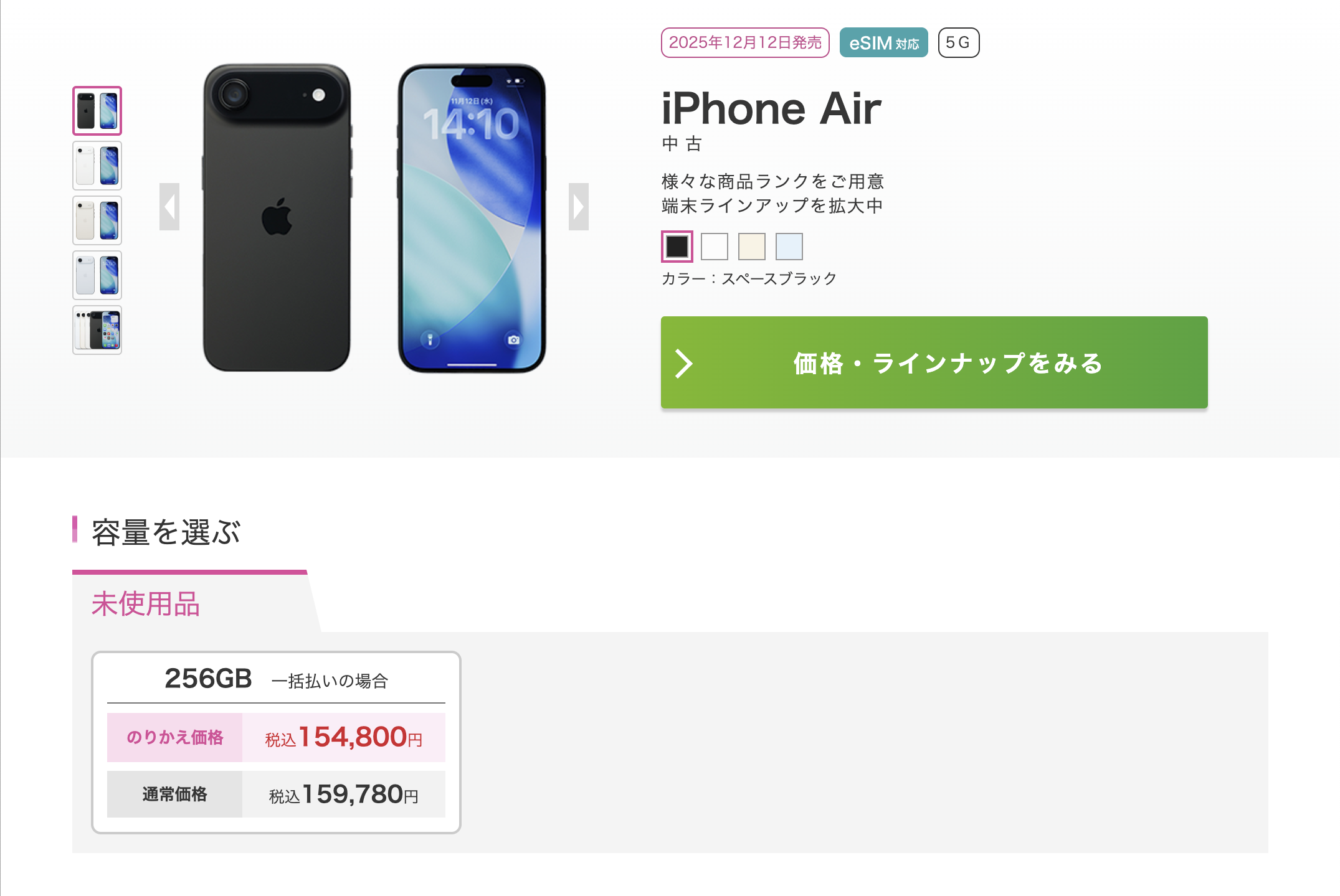 IIJmioのiPhone Air(256GB)中古未使用品の価格は159,780円。