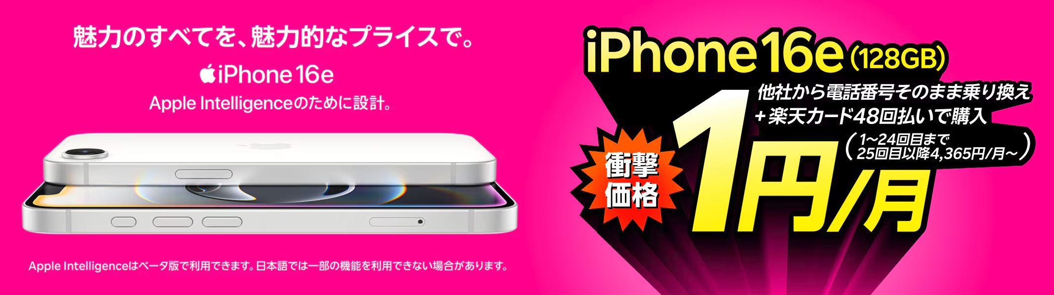 楽天モバイルで今やってる「1円キャンペーン」を使うと、iPhone16e(128GB)が月々たった1円で使えるんだ。