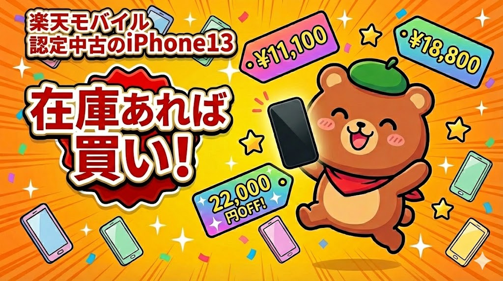 「Rakuten 認定中古」のiPhone 13とiPhone 13 miniは22,000円OFFクーポン使うと、かなり安いと思う。iPhone 13(128GB)ならクーポン使えば18,800円〜。